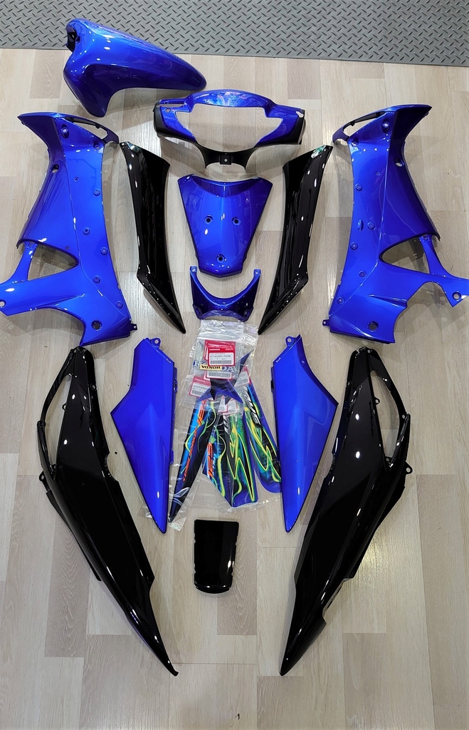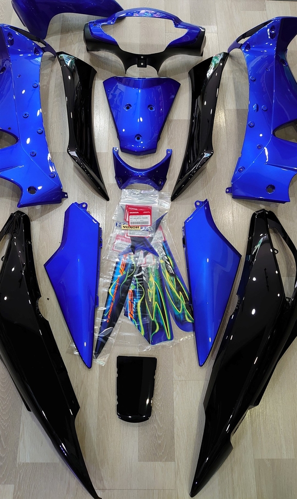 Bộ dàn áo gồm 13 món nhựa bóng và tem, đời Honda Wave S125 2005 - 2006 màu xanh dương - đen tem lửa,có thể sử dụng chung với Honda Future Neo , Neo GT , Neo Fi các đời.
