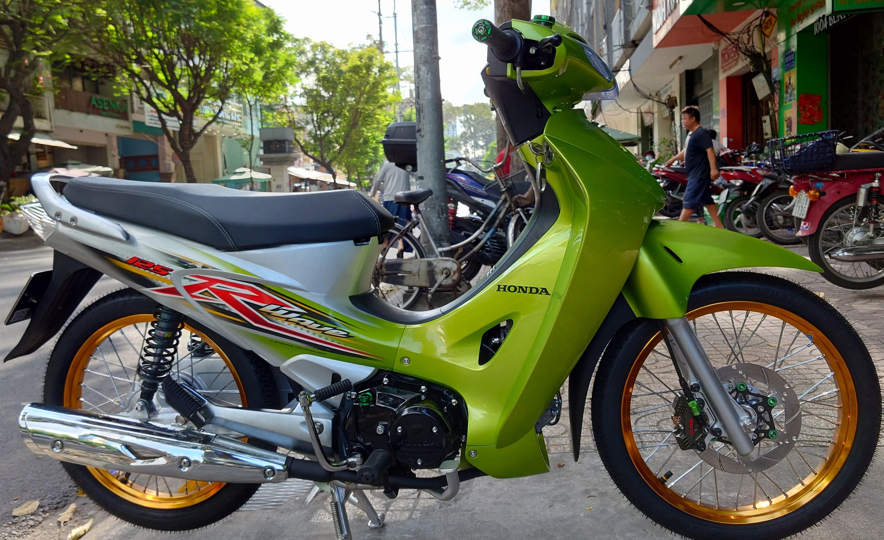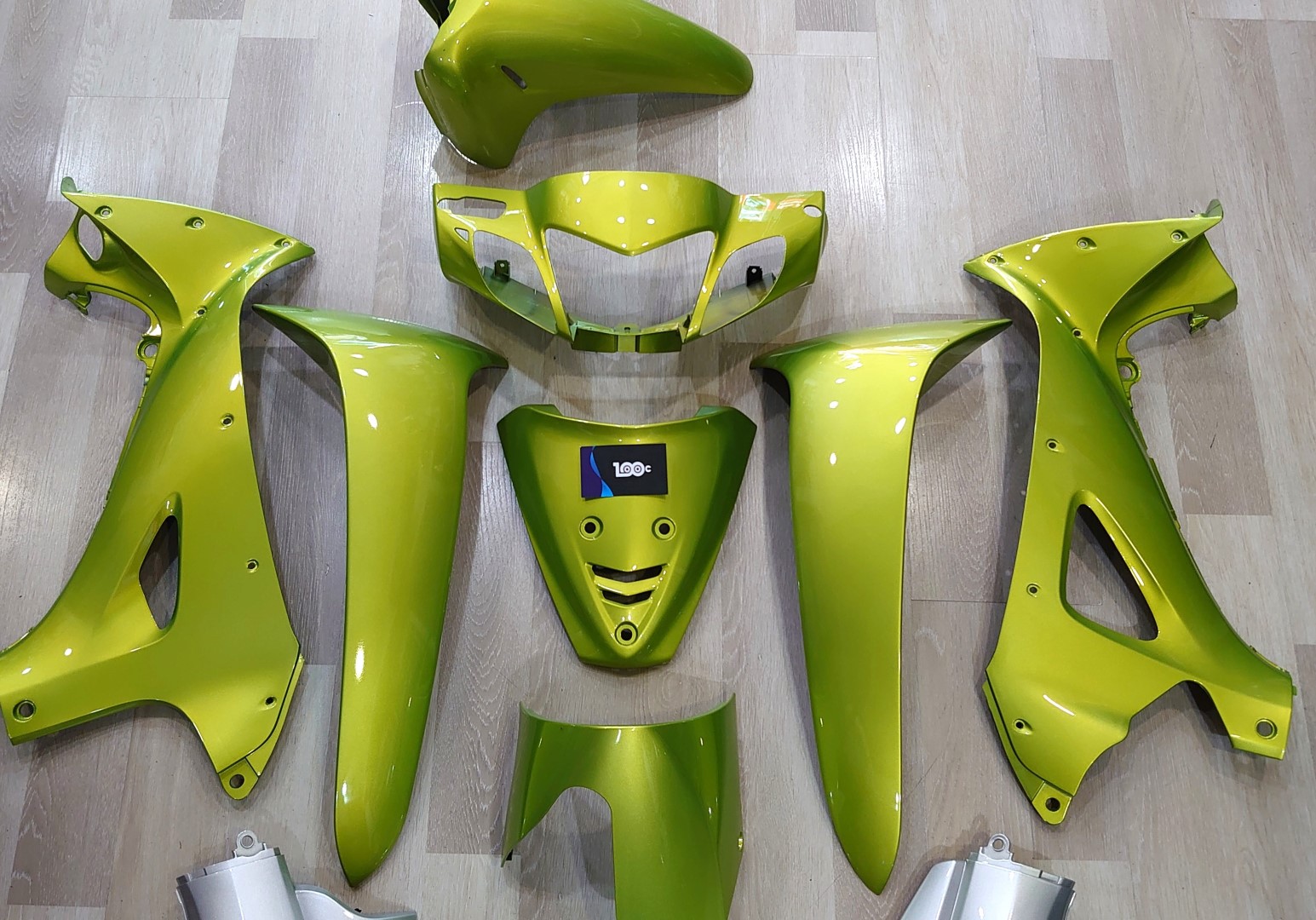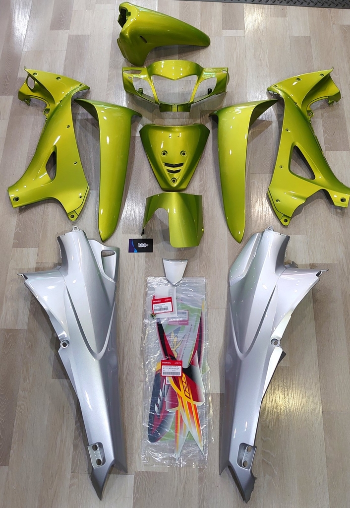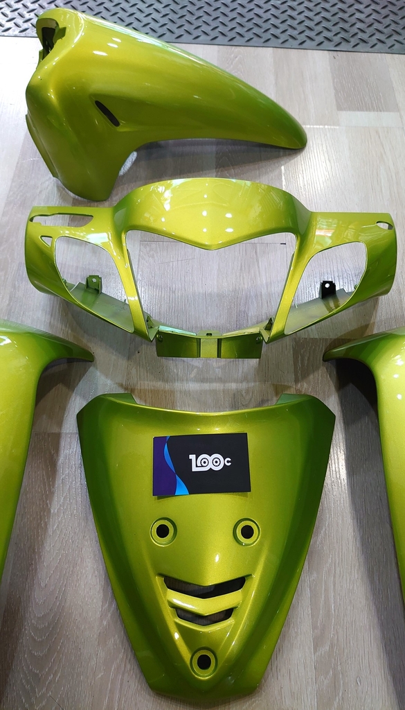 Bộ dàn áo gồm 11 món nhựa màu xanh lá - bạc và tem , đời Honda Wave 125 năm 2005 , có thể sử dụng chung với Honda Future 2 đời 2005 hoặc Honda Wave 125 cùng đời. Đèn pha trước tương tự Honda Future 2
