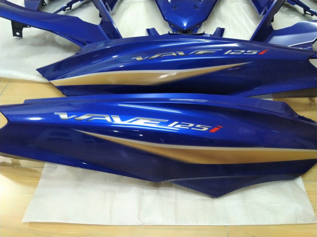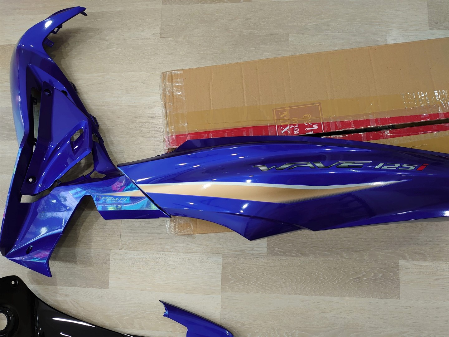 Bộ dàn áo Honda Wave 125i mẫu Led 2019 màu xanh dương, mẫu 2019 đã được hãng dán tem sẵn, phần mặt nạ trước dán tem rời.