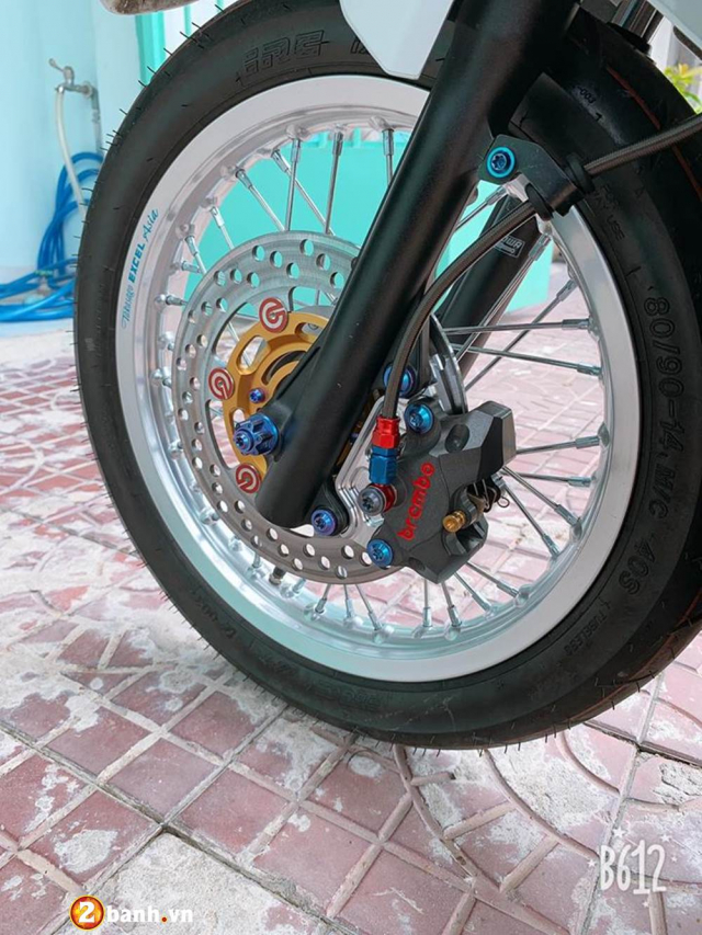 Nhìn xuống dàn chân ước tính dàn combo này phải tiêu hao hơn 15 triệu đồng bao gồm heo dầu Brembo Billet 2 pis đối xứng, kết hợp cùng đĩa Brembo Moto3 220mm và dây dầu Hel được bấm các ngắt dầu CNC, đây là những món đồ chơi thường được dùng trên bánh sau của một số mẫu xe PKL nên để bắt heo dầu vào phuộc Showa zin ở phía trước, chủ xe phải làm thêm một thớt lòng CNC.